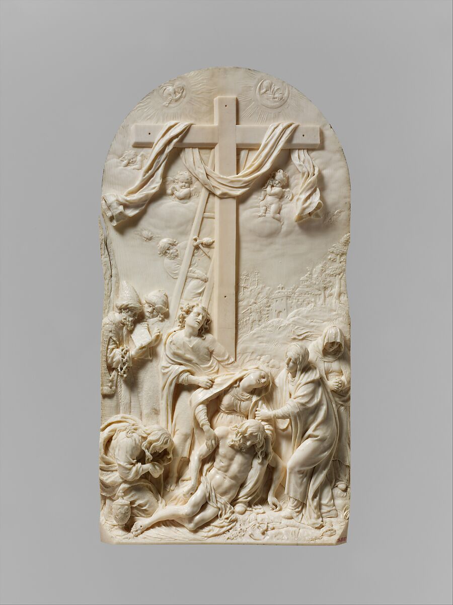 The fine perspectival gradations of relief create a painterly effect of distant background while the foreground is filled with vivid detail-the finely carved crown of thorns, the carefully observed leafy ferns, the bent nails removed from holes clearly indicated on the cross. Lenckhart often employed such detail to great expressive effect; here, the precise carving of the strands of hair curtaining the face of the Magdalen draws our gaze to her grief-stricken form.