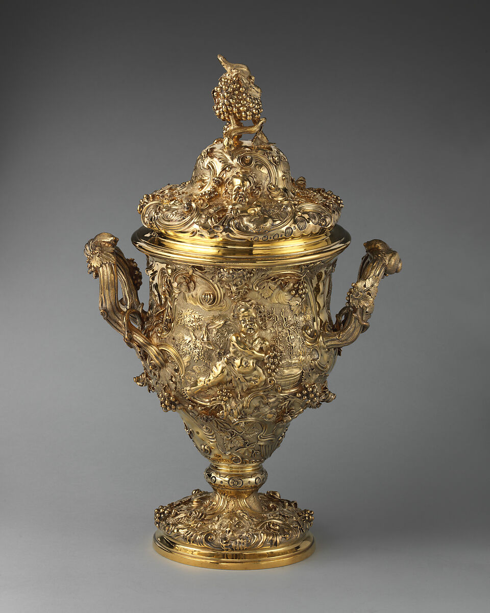 Paul Lamerie, the maker of this loving cup, was appointed goldsmith to the king in 1716. His long career began when the Queen Anne style was paramount and lasted through the early stages of the Rococo in the 1730s to the extravagantly energetic phase of the style in the 1740s. This loving cup, silver-gilt throughout, is an example of the full-blown Rococo of the early 1740s, of which Lamerie was the leading exponent. The bell-shaped cup with a pear-shaped "dropped bottom" is completely covered with chased ornament. The figure and most of the surrounding applied ornament allude to the young Bacchus as the god of wine. The ribbed handles are vine branches and the cover finial is a bunch of grapes. The arms of the owner, a member of the Hodgson family, are engraved on the side, with the motto "Pax et Fides" (Peace and Faith).