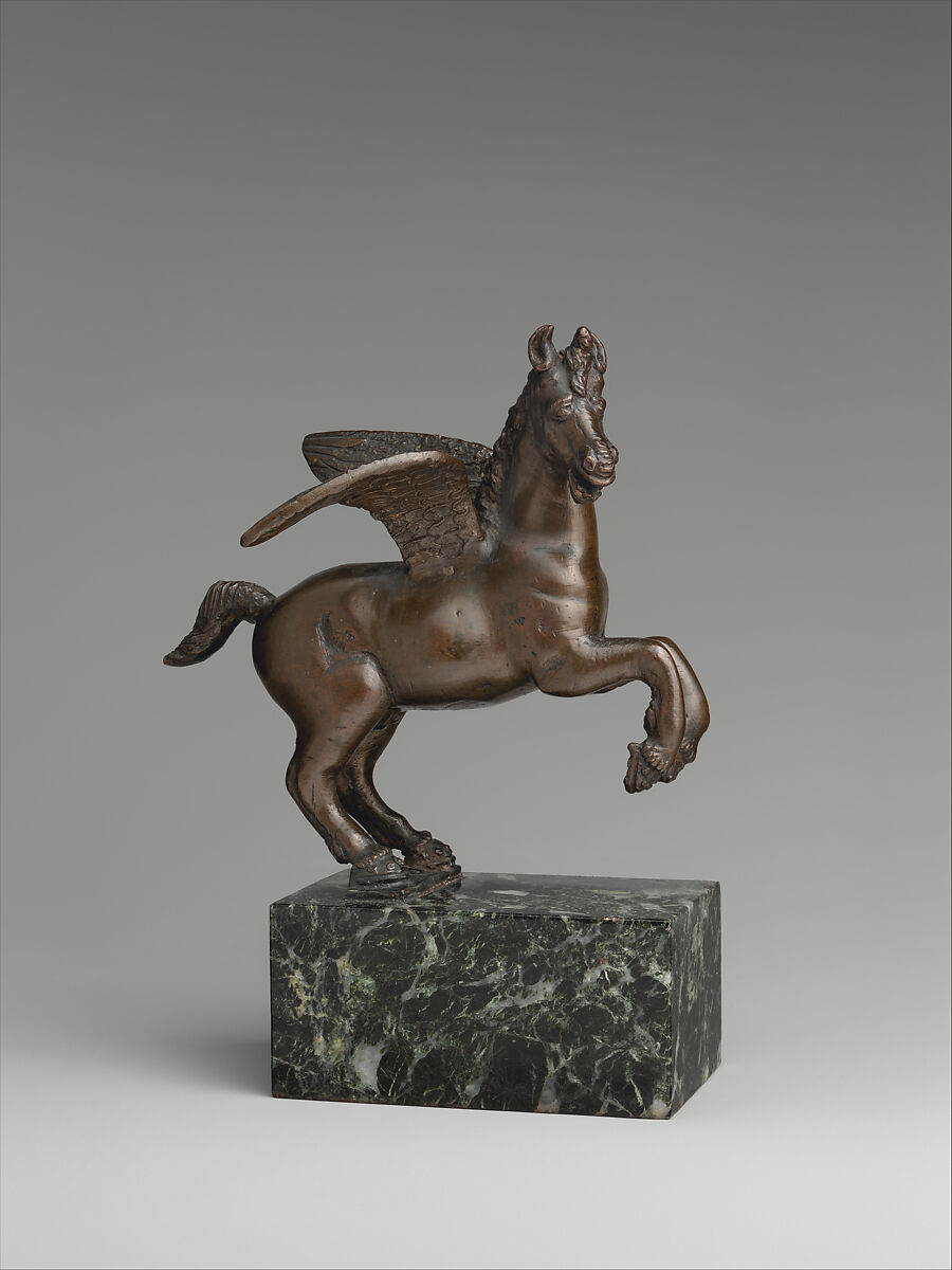 Two separate types of the rearing Pegasus are known. Both are associated with the ubiquitous workshops in Venice and especially Padua that produced small bronzes in large quantities for the educated middle-class market. The first type shows the rearing horse supported by a bronze strut modeled to emulate a landscape form; it dates to around the mid-sixteenth century and is about 30 cm in height.[3] In the second type, represented by The Met example, the horse is supported only by the twin points of its rear hooves. Models of this type date to the late sixteenth century, are about 16 to 18 cm in height, and have been associated with the Venetian workshop of Nicolò Roccatagliata.[4]