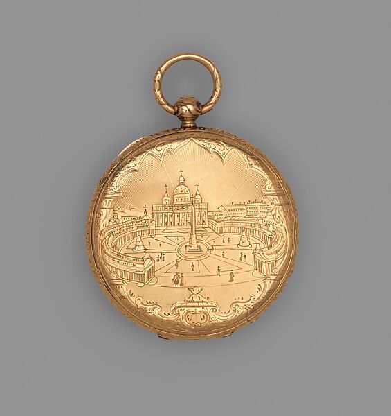 The Museum’s watch was finished, according to the firm’s records, in 1844.[19] Housed in a thin Hunter-style case, the movement has a Lépine layout but retains a cylinder escapement instead of the more up-to-date lever escapement. The front cover of the case is engraved with a view of Saint Peter’s Square, bordered at the top by a Gothic-inspired ornamental design, and at the bottom by one reminiscent of the baroque. It is hinged to the reeded band of the case at the nine o’clock position, and when opened it reveals a white enamel dial covered by glass held in place by a thin gold bezel. The dial is painted with black enameled roman numerals (I–XII) for the hours and individual strokes for the minutes. Remarkably slim gold hands of the Breguet type and the firm’s name, “VACHERON ET CONSTANTIN,” painted at the four o’clock position complete the simple but elegant design.