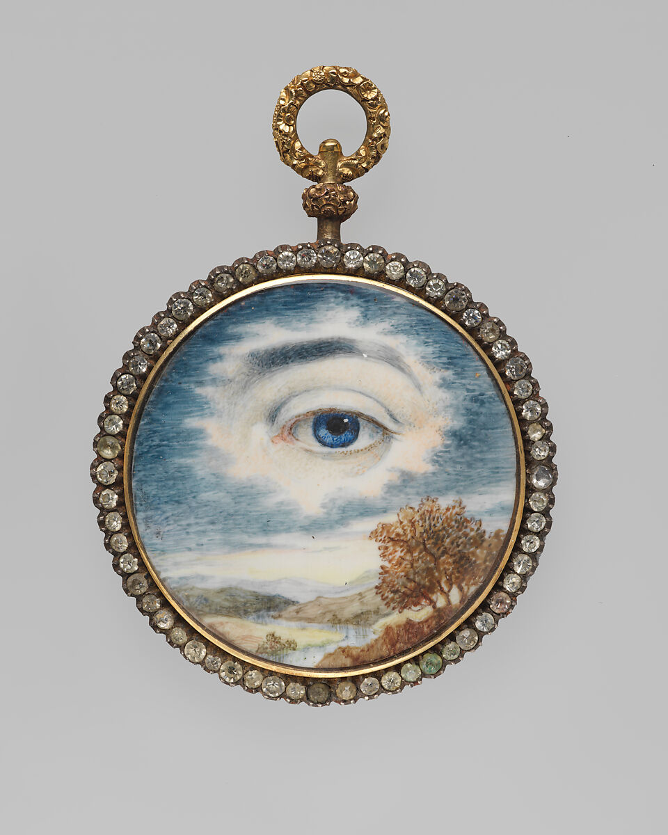 Miniature paintings in watercolor on ivory, of a single eye, were introduced first in France and quickly became a fad in Great Britain in the late eighteenth-century. This art form later transferred, in a modest way, to the United States by the early nineteenth-century. They came to be known as “lover’s eyes” –- intensely private objects, usually of the giver’s eye presented to a loved one. The disembodied eye allowed the viewer to gaze upon the object of their affection, known only to them, and then, actively, the gaze was returned. Eye miniatures also served as mourning jewelry for lost loved ones.