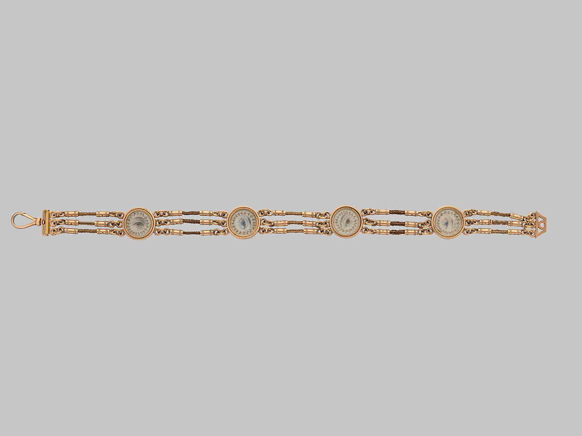 - Medium:4 watercolor on ivory lover’s eyes set in gold cases and attached to a gold and hairwork chain