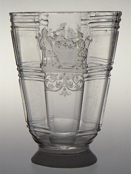 The engraved scenes represent activities of the four seasons. This side is winter—a couple enjoying tobacco and a cup of chocolate. The glass probably once had a silver mount around the foot.