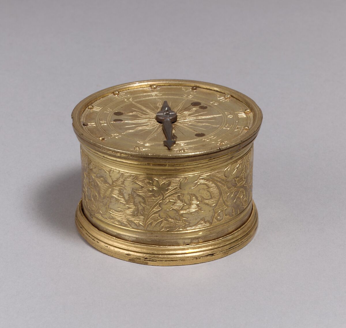 This variety of small, portable timekeeper, which was made for many years, was probably intended to be carried with or on the person. The type existed as early as the middle of the fifteenth century and therefore may be regarded as a forerunner of the watch. The iron wheel-balance of this one is missing.