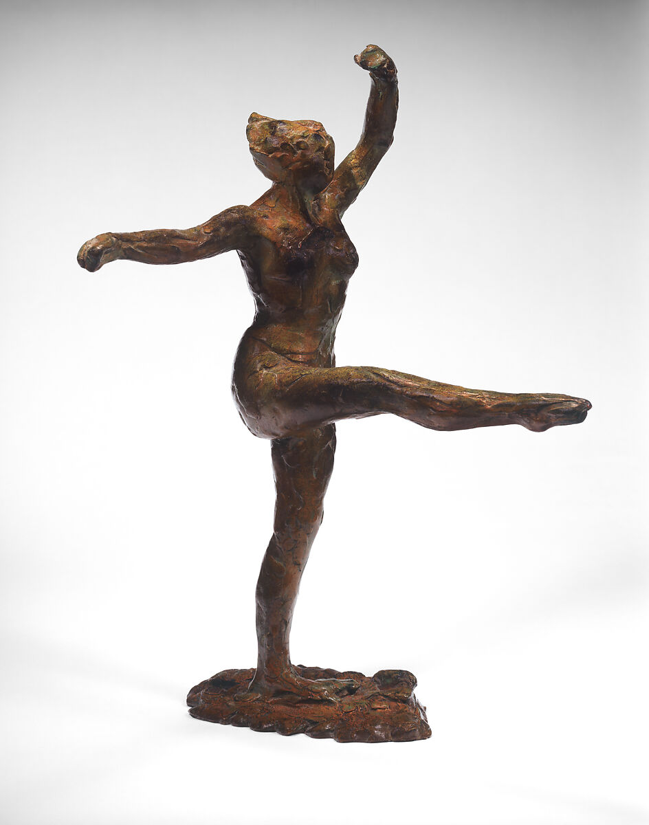 Upon Degas's death in 1917, more than 150 figurative sculptures were found in his studio. Most were made of fragile wax, clay, and plastiline (a wax- and oil-based modeling material). Many had deteriorated. Only a few were preserved in copies that had been cast from them in plaster. Except for the wax Little Fourteen-Year-Old Dancer (Washington: NGA) none of these sculptures had been publicly exhibited during the artist’s lifetime.