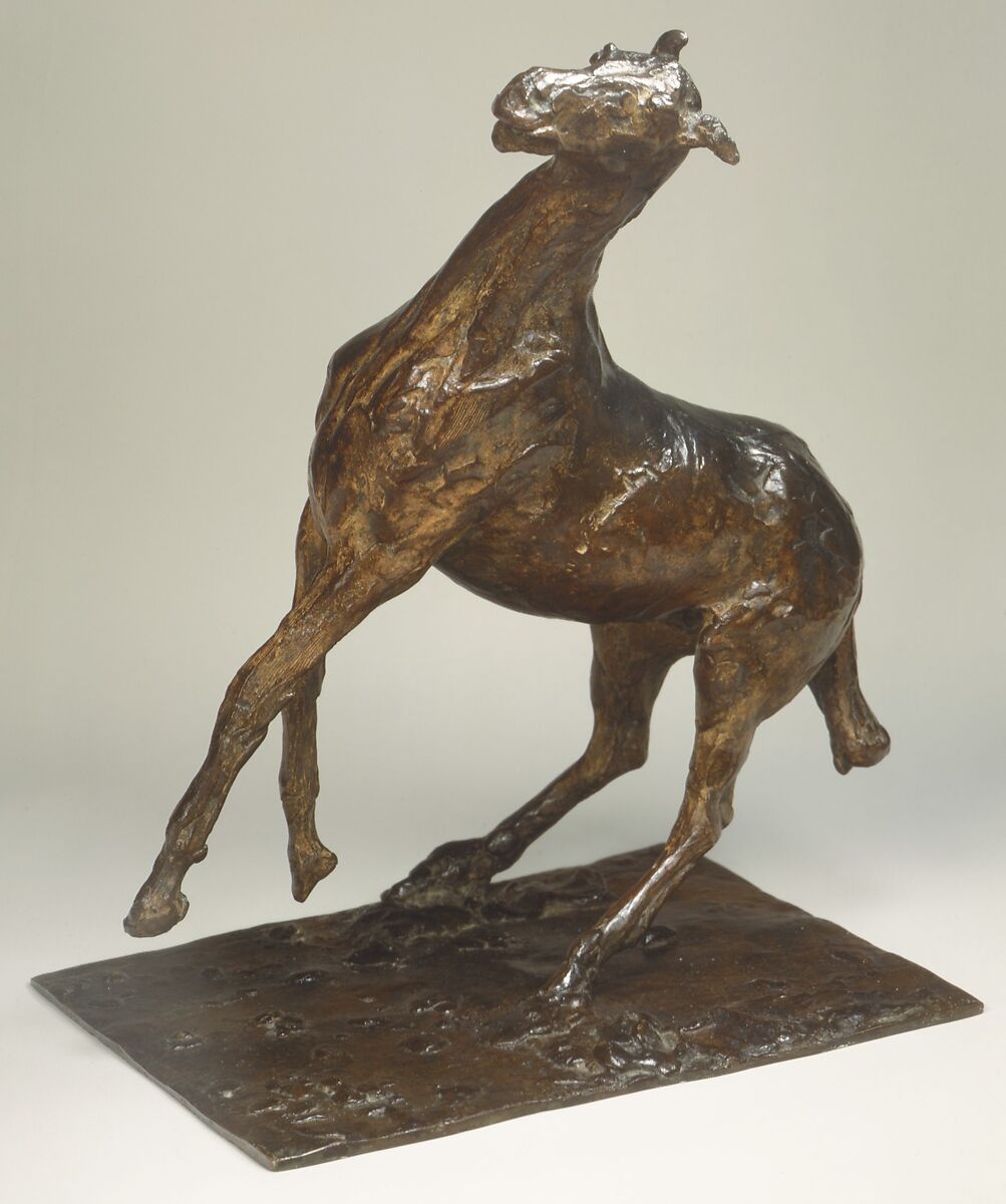 Upon Degas's death in 1917, more than 150 figurative sculptures were found in his studio. Most were made of fragile wax, clay, and plastiline (a wax- and oil-based modeling material). Many had deteriorated. Only a few were preserved in copies that had been cast from them in plaster. Except for the wax Little Fourteen-Year-Old Dancer (Washington: NGA) none of these sculptures had been publicly exhibited during the artist’s lifetime.