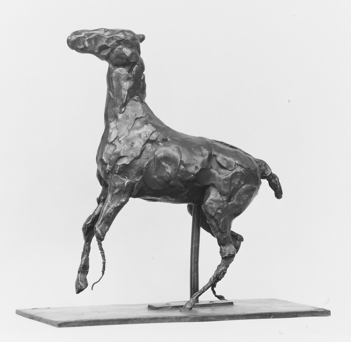 Upon Degas's death in 1917, more than 150 figurative sculptures were found in his studio. Most were made of fragile wax, clay, and plastiline (a wax- and oil-based modeling material). Many had deteriorated. Only a few were preserved in copies that had been cast from them in plaster. Except for the wax Little Fourteen-Year-Old Dancer (Washington: NGA) none of these sculptures had been publicly exhibited during the artist’s lifetime.