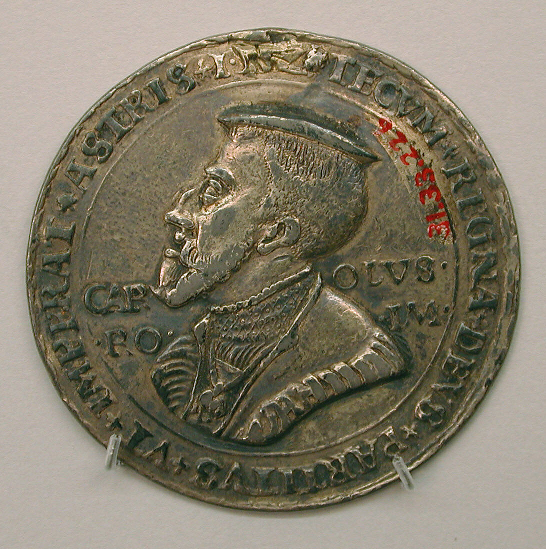The obverse of this medal depicts Charles V and the reverse his coat of arms.