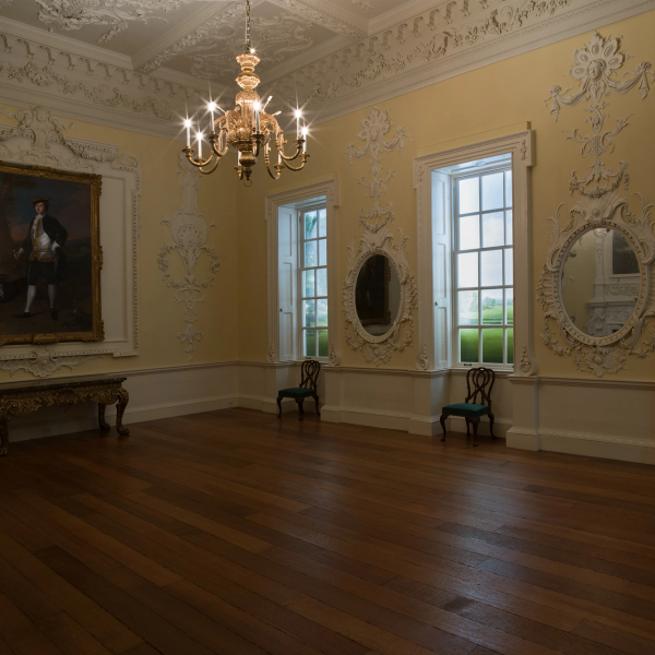 NARRATOR: Welcome to the dining room from Kirtlington Park, which was dismantled in the 1950s and reassembled in New York. The intricate stucco that lines the ceilings and walls is by Thomas Roberts, using plaster molds copying popular designs made in Italy. Up close, you can admire the naturalism of the details, such as the plumes of feathers, of the Imperial Roman eagle. The festoons of wheat, fruit, and flowers–also sculpted with great precision– suggest endless bounty and connect to what would have been the grand landscape outside. Quite directly, in fact: the oak floors were likely carved from trees felled on the estate.