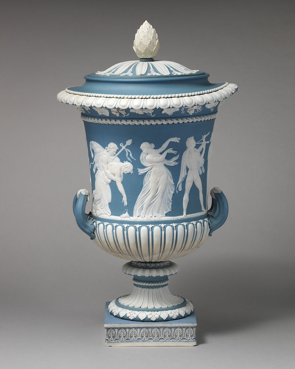 This urn reflects Wedgwood's adaptation of the Borghese Vase, a monumental marble vase produced in Greece in the 1st century B.C. Discovered in Rome in 1566, it became a source of inspiration for European artists.