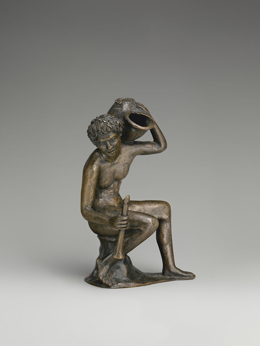 All nine variants of the Youth carry shell-shaped containers. One might speculate that Riccio’s original lost model was designed to represent a vessel- or water-bearer. Water-bearers were unofficial civic symbols in Venice, where fresh water was precious. They appear, for example, as standing figurative stone rainspouts on the facade of the Basilica of San Marco, and as a bronze statuette above the doorway in Vittore Carpaccio’s painting of the Dream of Saint Ursula of 1495 (Gallerie dell’Accademia, Venice). The Venetian patrician Marcantonio Michiel recorded Riccio’s lost statuette of a striding vessel-bearer (“nuodo in bronzo che porta el vaso in spalla e camina”) in the collection of Marco Mantova Benavides in Padua.[7] Perhaps Riccio created the Youth to represent a seated version. If so, its complex, foreshortened, crouching pose would have meaningfully recalled an esteemed Roman civic emblem, the ancient bronze seated Spinario (thorn-puller) that had become a popular subject for statuettes created by the shop of Riccio’s northern Italian contemporary Severo da Ravenna (see cats. 39, 40). And perhaps it is no coincidence that one of the most famous antiquities in the Veneto, the monumental marble fountain figure of Hercules kneeling and crouching beneath the weight of a shell-shaped sundial, was given to the city of Ravenna by Riccio’s patron Girolamo Donà in 1493.[8] Popularly called Conchicollo (“he who bears a shell on his neck”), this civic centerpiece might also have provided an inspirational context for Riccio’s invention.