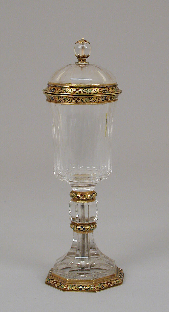 The form of the cup and the crystal cutting are characteristic of the mid-17th century style of the Prague Imperial Court Workshop.