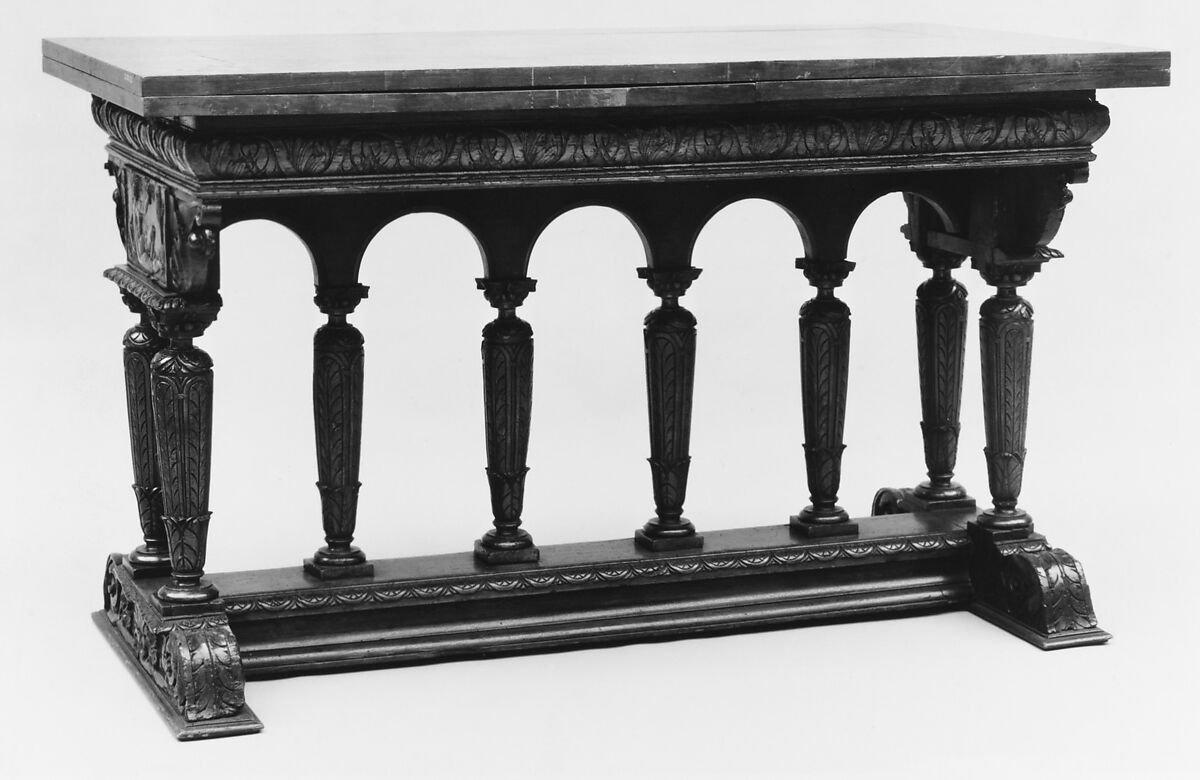 In the sixteenth century, simple planks resting on trestles gave way to tables with sturdy, fixed supports of varying design. Following an architecturally inspired scheme that gained favor during the reign of Henri II (1547–59), this example has a rectangular top supported by leaf-carved balusters that form an arcade. Panels at either end feature personifications of seasons: Spring, with flowers, and Summer, with wheat.