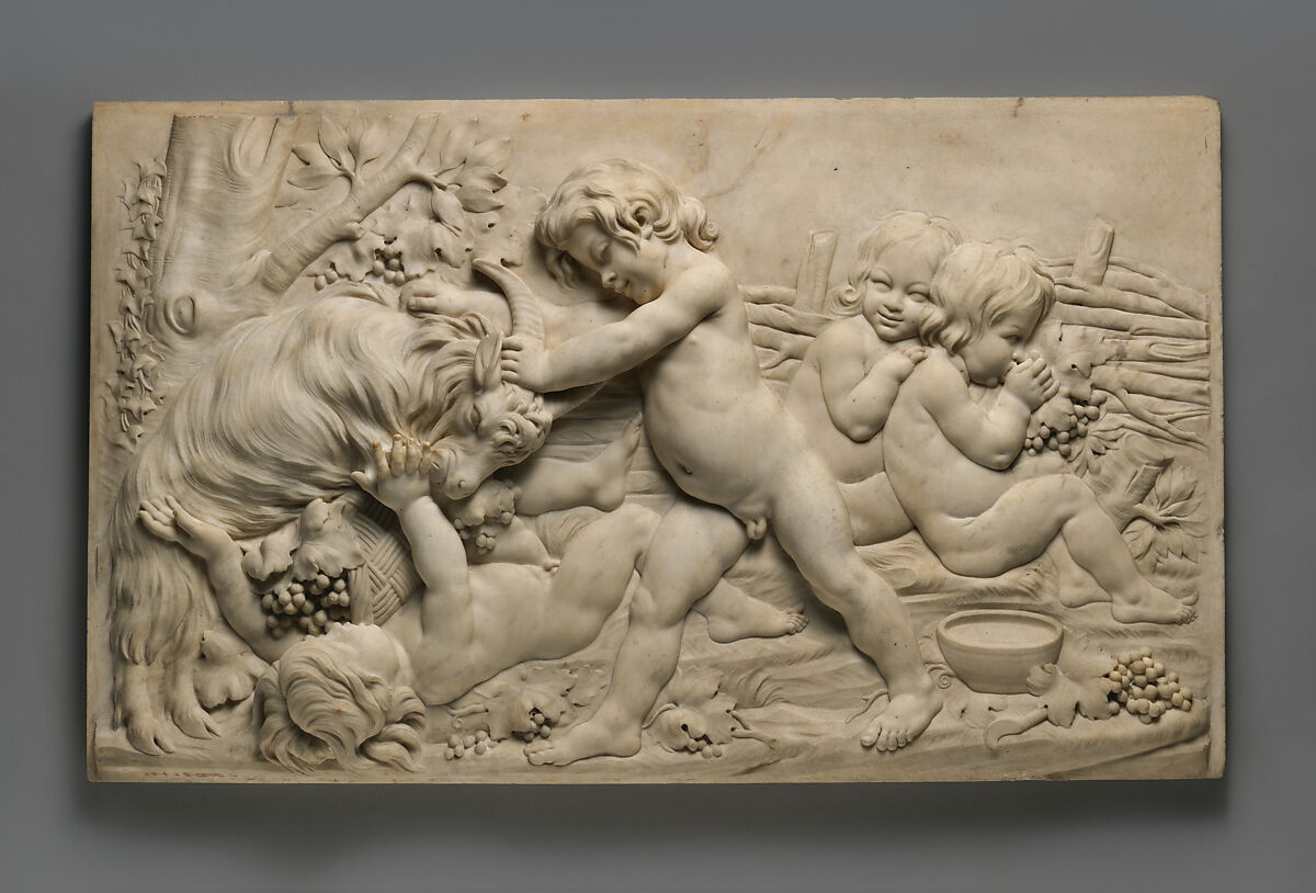 This set of four Seasons (35.104.1–.4) are copies at reduced scale of limestone reliefs on Bouchardon's fountain in the rue de Grenelle, Paris, commissioned in 1735 and finished in 1745.