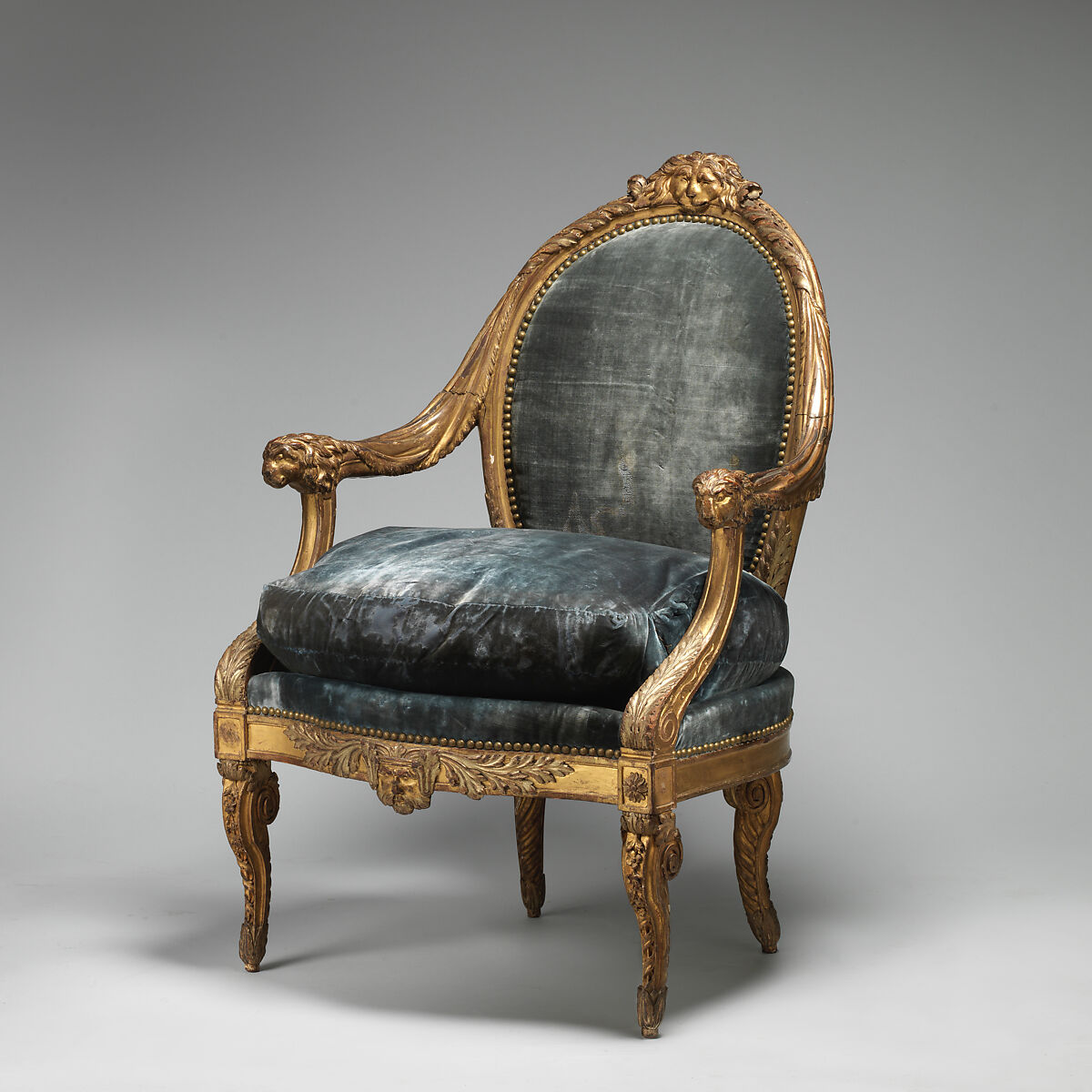 - Medium: Carved and gilded pearwood, blue velvet upholstery