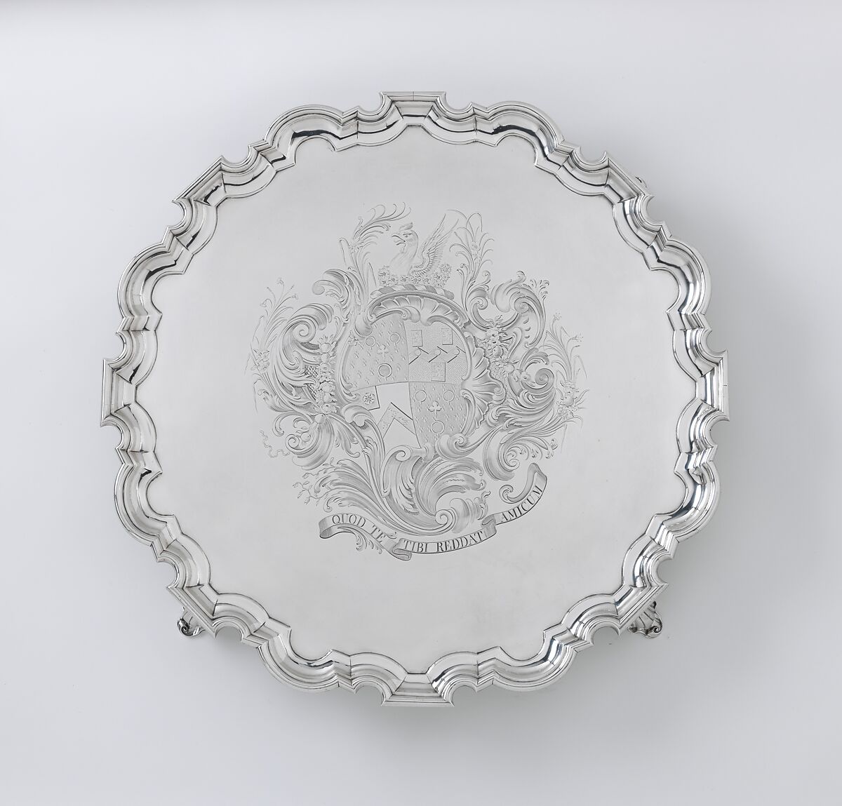 The coat of arms on this salver, engraved in an exuberant rococo cartouche, is the sole decoration on the otherwise plain surface. The salver, used to hold a tea service, was commissioned as a memento by Judith Jodrell, who bought it using money bequeathed to her by two close friends. The monogram and inscriptions on the reverse commemorate these attachments.