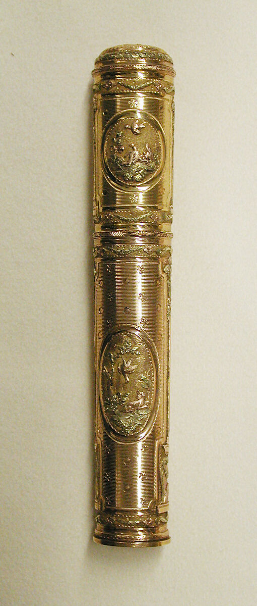 In eighteenth-century Europe, Paris led the production of high-quality luxury goods. Parisian goldsmiths made a wide range of small, personal articles such as snuffboxes; étuis to hold sealing wax, tweezers, or utensils for sewing; souvenirs, which contained thin ivory tablets for note taking; and shuttles for knotting lace. Gold snuffboxes and boxes decorated with portrait miniatures were prized and frequently given as royal gifts, often to ambassadors or members of the court in lieu of cash payments for their services. Coveted and admired, these boxes were produced from a variety of materials. The best were skillfully made of gold and embellished with diamonds, enameled decoration, lacquer, and other luxurious materials. By the middle of the century, the taking of snuff had become an entrenched social ritual, and the snuffbox, too, had become an important social prop. Snuffboxes were considered highly fashionable accessories, with some merchants advertising new boxes with each change of season. The popularity of snuffboxes extended to all levels of society, and for those who could not afford gold, boxes were produced in less expensive materials such as silver, tortoiseshell, porcelain, or domestically produced lacquer.