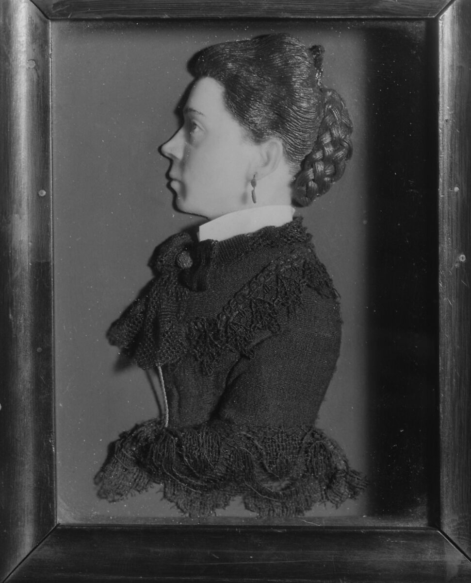 - Medium: Relief: colored wax with dress of applied black cloth and lace; background: slate (?), painted reddish brown; frame: wood