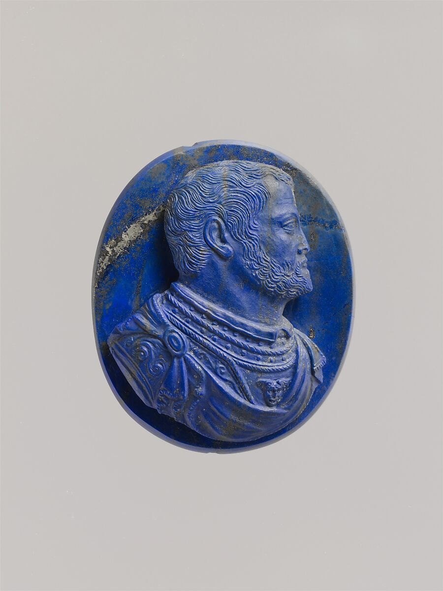 Lapis lazuli is a notoriously brittle medium for detailed carving, but the highly specialized Florentine grand-ducal workshops overcame many challenges as they fashioned and assembled hardstones. This portrait of Cosimo de’ Medici is more generalized than those on the medals it is based on, no doubt owing to the extra caution that had to be taken with the drilling. The cameo appears in Medici inventories, described as framed in ebony, between 1588 and 1628.