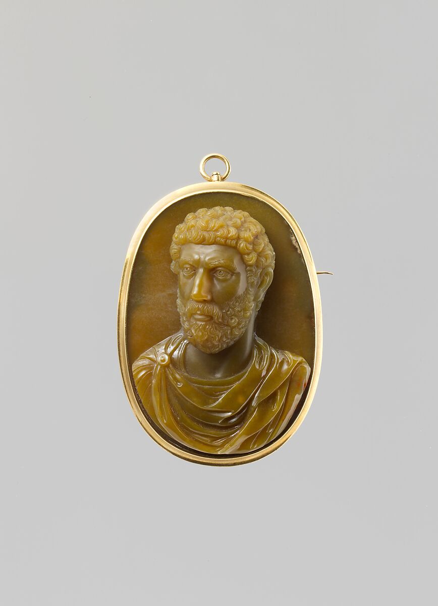 The man’s compactly curled hair and beard recall those of the Antonine emperors. Ernst Kris, author of the Weil catalogue, reasonably suggested Aelius Verus, whom Hadrian adopted as praetor and consul but who predeceased him by drinking poison. Aelius Verus was habitually shown with an anxiously knitted brow. This largish caramel-hued gem was in the Marlborough collection in the eighteenth century.