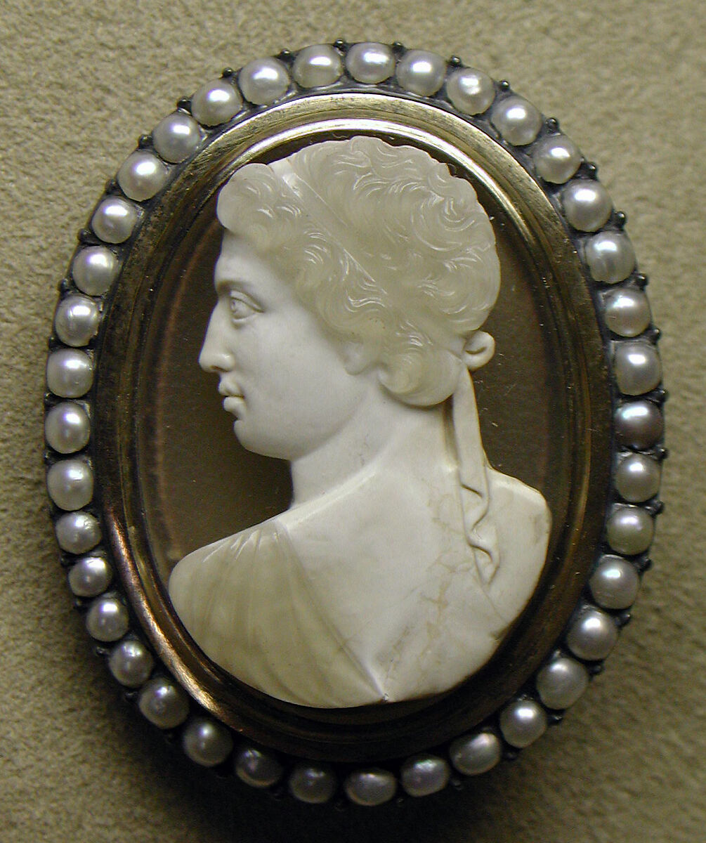 - Medium: Sardonyx, mounted in gold with pearls as a pin