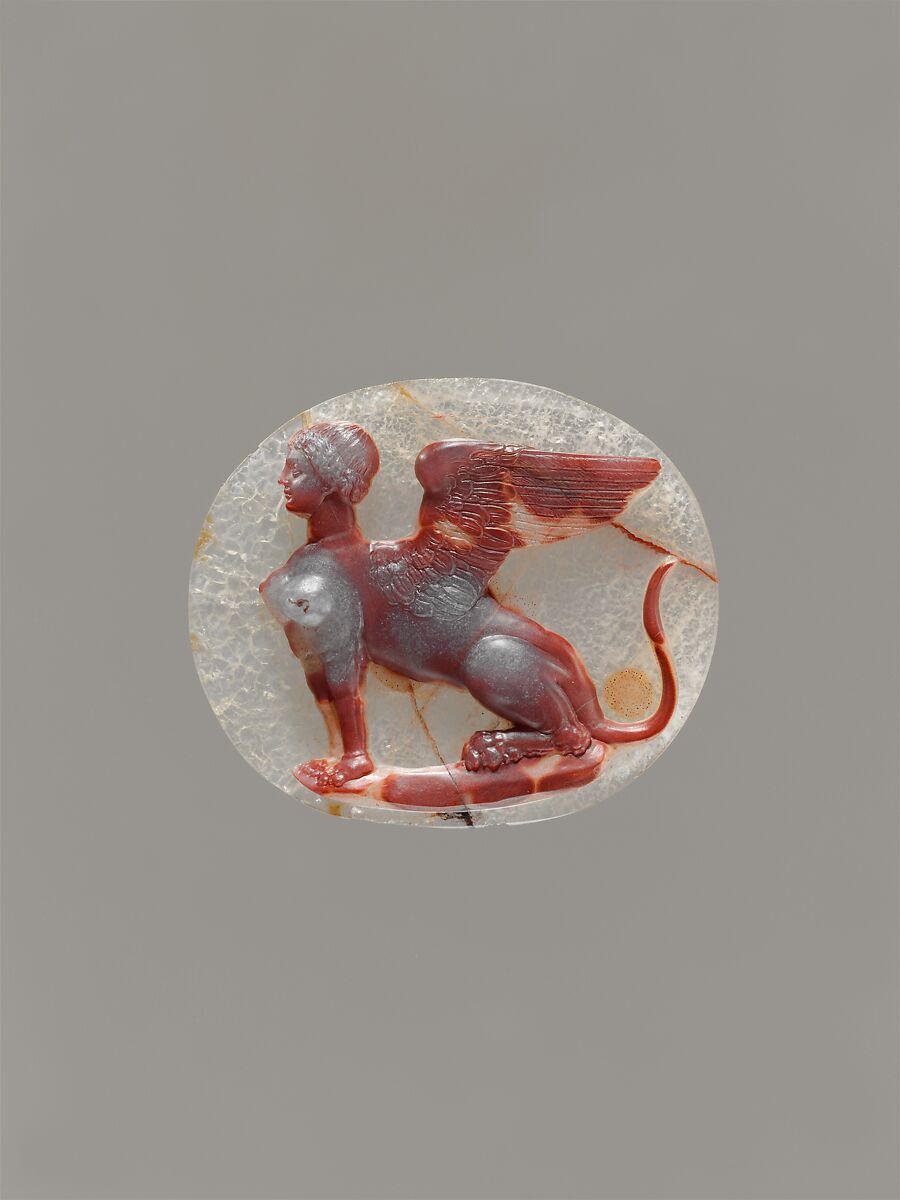 Sphinxes all’antica, like Medusa heads, were enigmas often invoked in Neoclassical decorative arts. Someone took pains to preserve this piece after it broke, expertly repairing it with closely matched stone, then gluing it to a glass backing that has since been removed from the quartz ground layer.