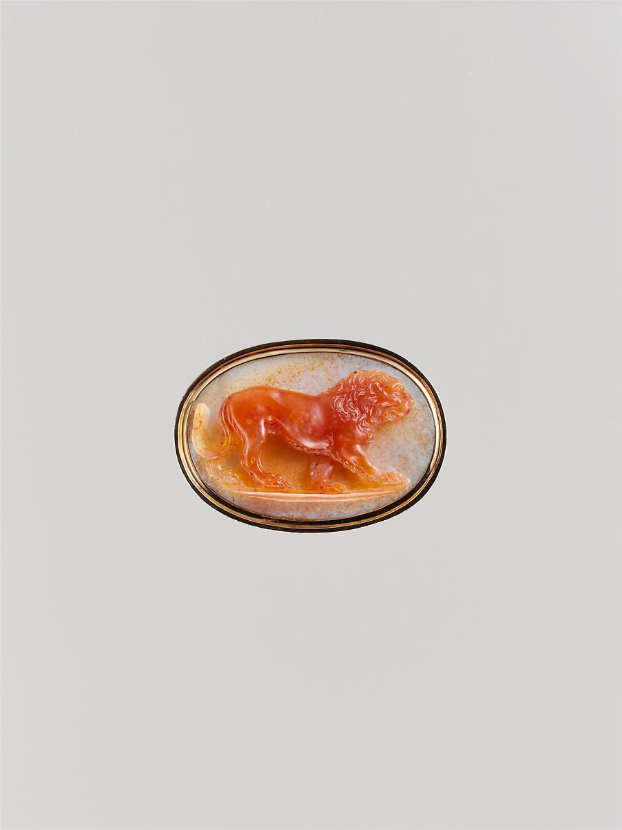 Cameos displaying animals, a mainstay of ancient Roman glyptics revived by Neoclassical engravers, filled the cabinets of European royalty. Particularly fetching is the way the carver of the leopard capitalized on brownish flecks in the stone to give the beast its spots. The grinning recumbent lion shows a fine contrast of matte and polished surfaces. The carver of the walking lion nearly exhausted the stone’s red layer when forming the tail.