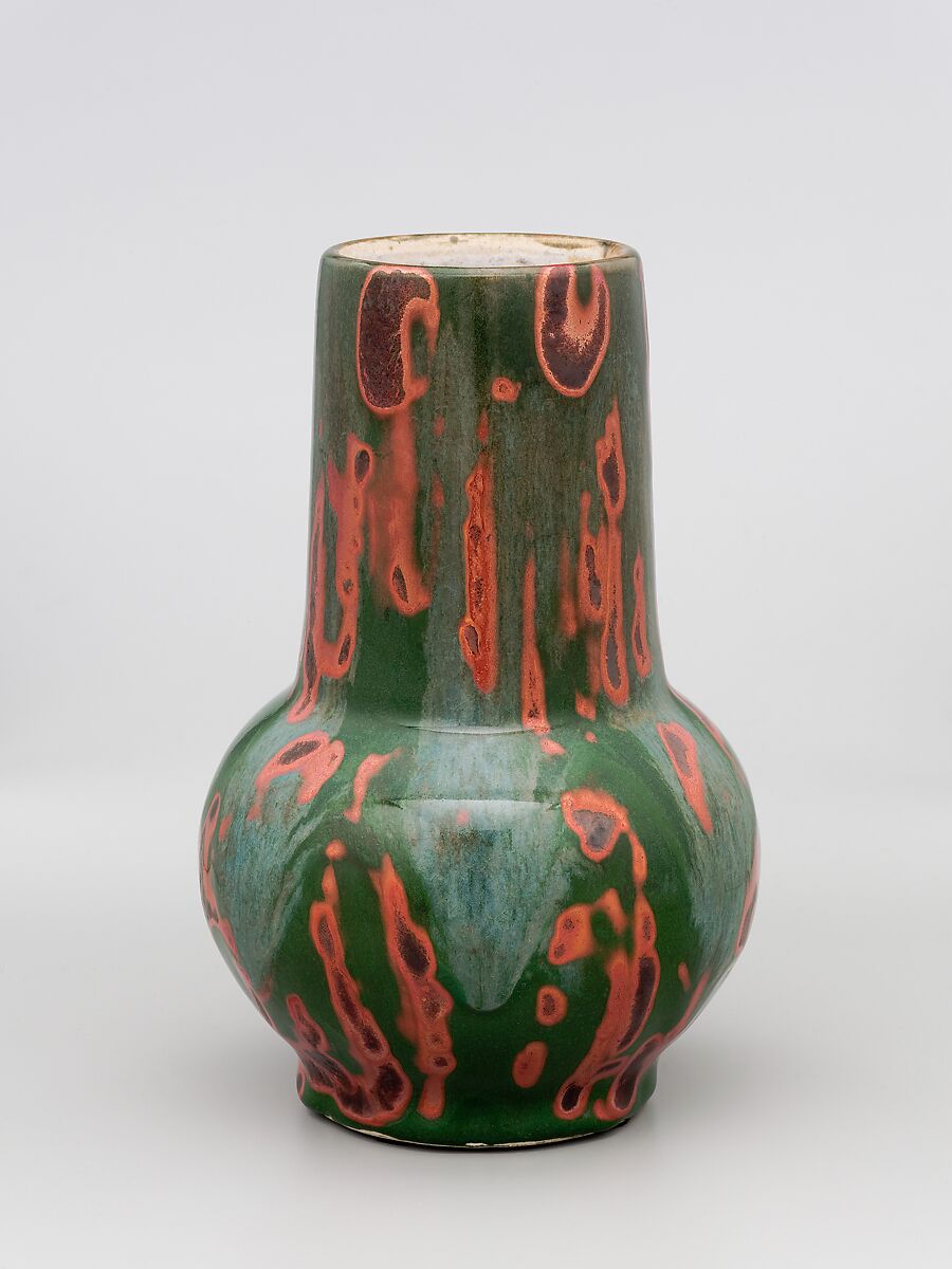From Chelsea to Dedham, Robertson continued to pursue his passion for innovation, employing the grayish-white stoneware used for Dedham’s dinnerware to throw simple forms covered with bold combinations of colored and textured glazes. Despite his financial backers’ stipulation against further research into sang-de-boeuf, or oxblood, glazes, Robertson did not entirely abandon that costly pursuit. Many of his Dedham vessels have brilliant layerings of red and purple glazes. Experimenting with a daring, difficult-to-control method, Robertson tried painting designs with glaze onto glaze, layering one over the other. The propensity for the glazes to flow together or even run off the vessel made this technique very challenging. This example features an application of orange red glaze over green with motifs that may originally have been intended to be representational but now appear boldly abstract.