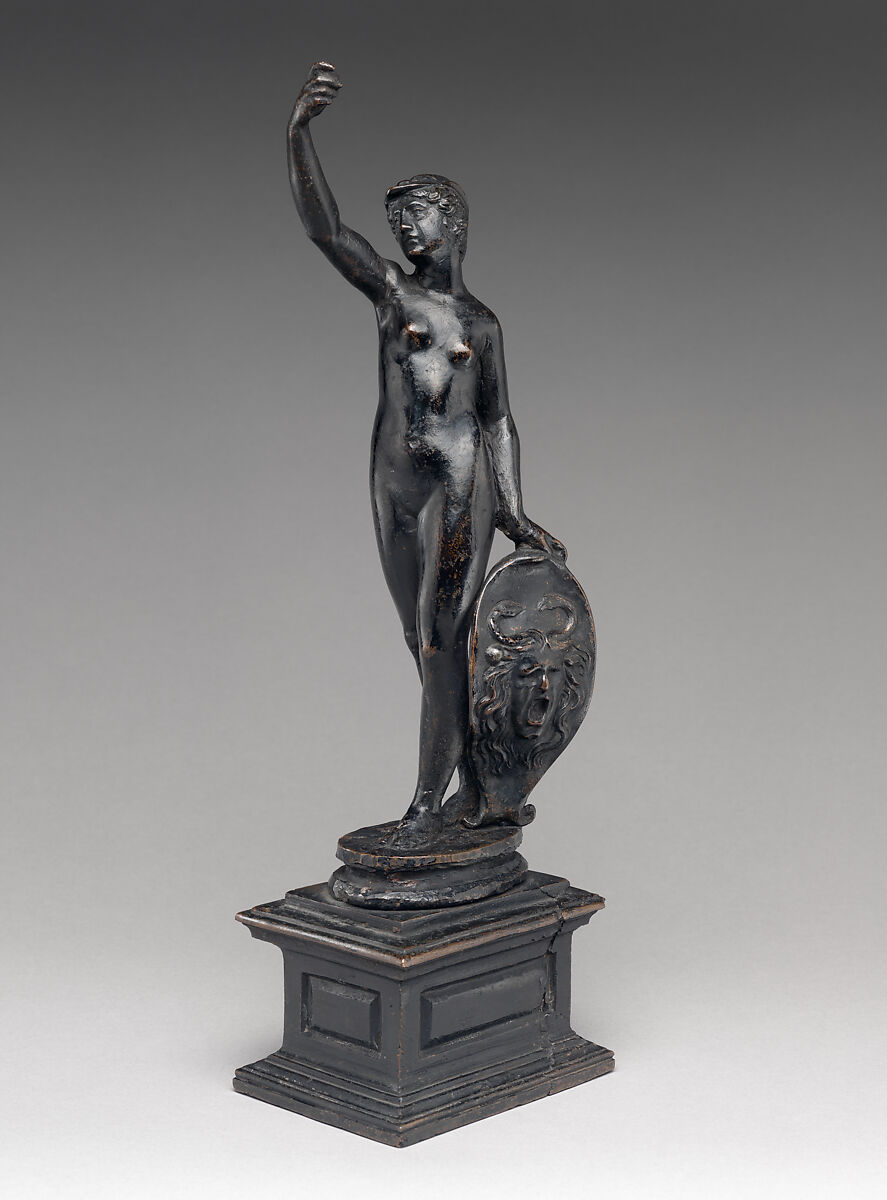 3. Following Bode (see note 1) and London 1912, cat. 49, as well as Rubinstein-Bloch, who catalogued them in 1926 in the Blumenthal collection, both Met bronzes were formerly called “free variants of the Minerva on the base of the Perseus in the Loggia de’ Lanzi, Florence” (ESDA/OF), but the relationship is generic and hardly compelling.