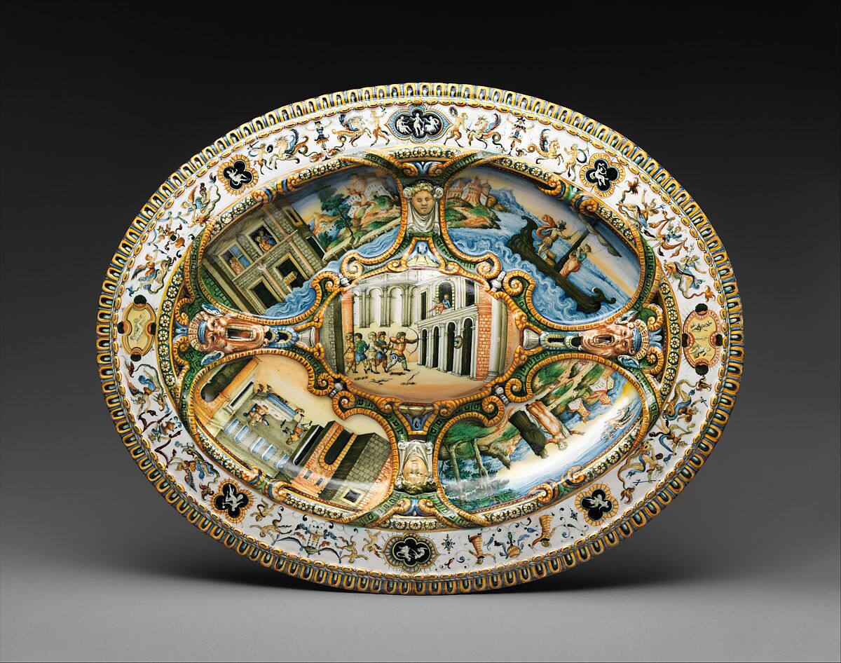 This basin is decorated with scenes from the chivalric tale of Amadis, who endured a number of trials in order to win his beloved princess, Oriana. Large serving dishes of this type would have been used communally, placed on the table within reach of several diners. In this case, the number and placement of the scenes suggest that it was intended to serve four, each with an image oriented in his or her direction.