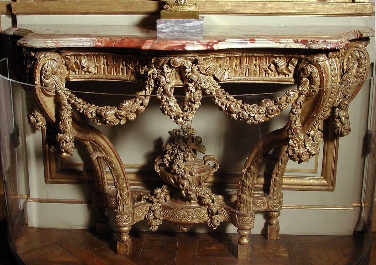 - Medium: Carved and gilded oak; Sarrancolin marble top