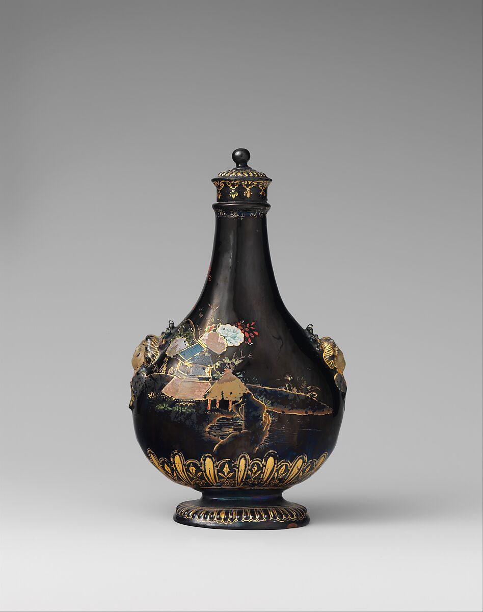 This little flask has the form of the traditional pilgrim bottle and was modeled by the Dresden court silversmith Johann Jakob Irminger (1635–1724), who was appointed artistic director of the Meissen factory in 1712. The material is the fine red stoneware first produced at Meissen. The flask's Baroque European shape contrasts with its decoration, which imitates Japanese lacquer.