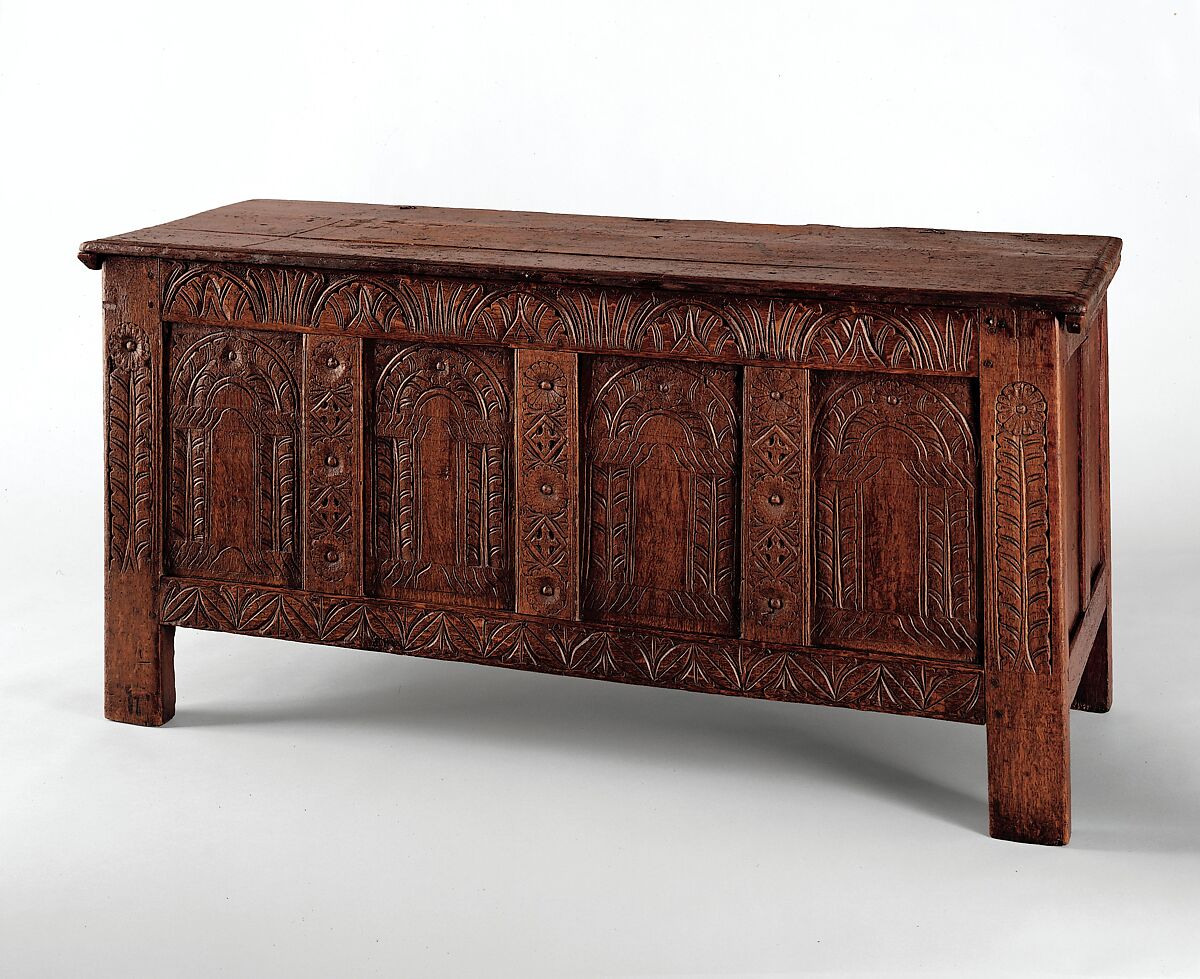 Chests used for household storage were common in seventeenth-century homes. This lift-top chest is embellished with carved motifs that are characteristic of the decorative vocabulary of the earliest New Haven joiners, including the carved arches in the panels, the lunettes on the upper rail, the paired leaves on the lower rail, and the rosettes on the stiles.