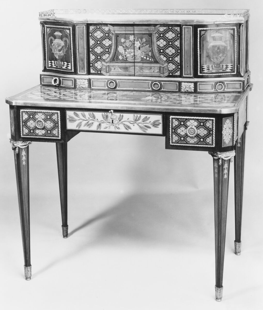 - Medium:Mahogany, tulipwood, harewood, boxwood, myrtle, holly, and ebony, on oak carcass; gilt bronze, marble