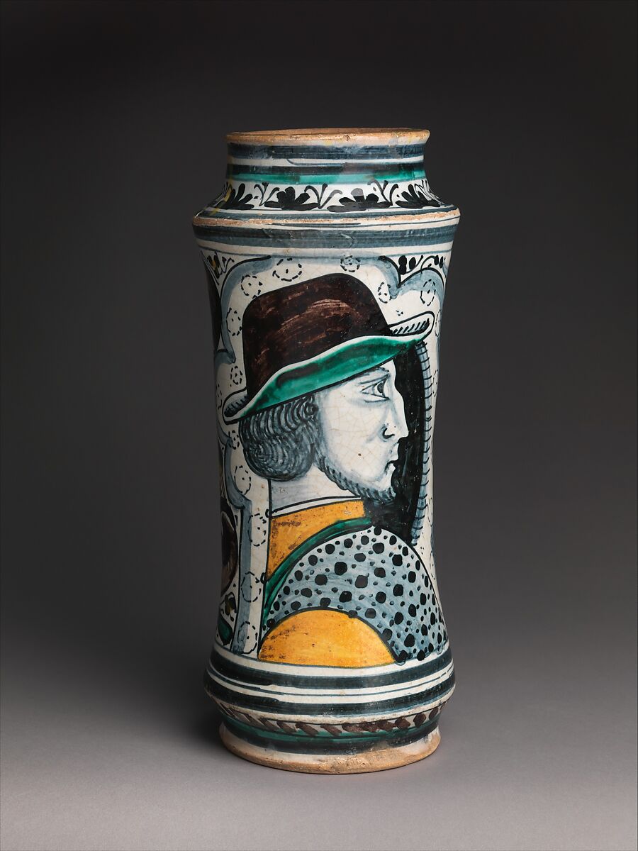 The distinctive profile of the man depicted on this storage jar might suggest that it is the portrait of a specific individual. It has been proposed that it represents King Charles VIII of France (1470–1498), who invaded Italy in 1494–95 and attempted, without success, to seize the throne of Naples.