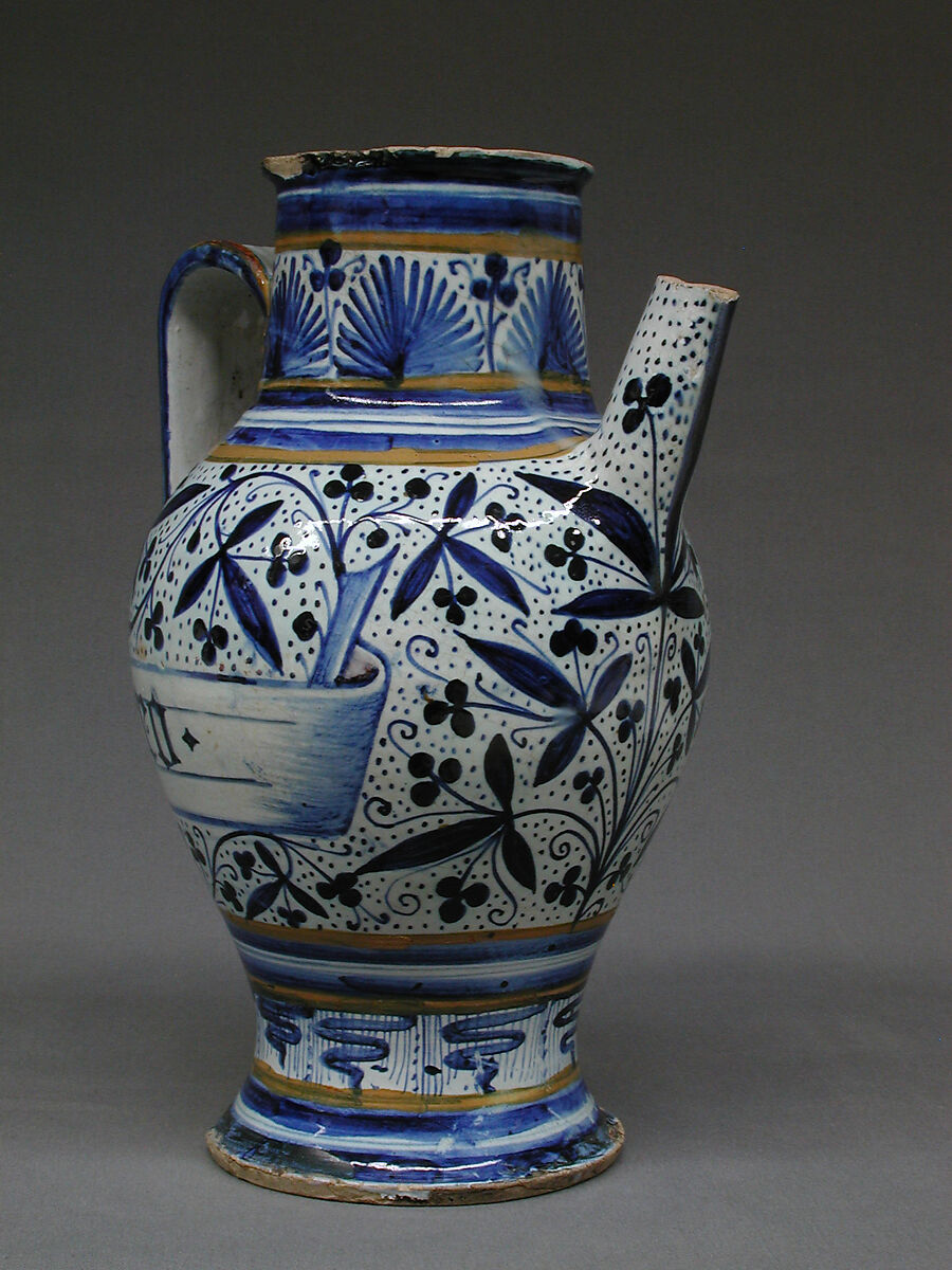 Storage vessels were among the most frequently produced maiolica wares in late medieval and Renaissance Italy. Made in fairly standard shapes, they were designed to fit with dozens of others on a shelf, often in a pharmacy or shop. Their handles therefore tend to fit within the vessel’s profile, and the cylindrical albarello type is generally narrower at the middle than at the top or bottom, making it easy to grip. Other common features include inscriptions indicating contents and flanged lips to help secure cloth or paper seals. The decoration, usually more elaborate on one side than the other, can sometimes link pieces to a known dispensary or specific workshop or artist.