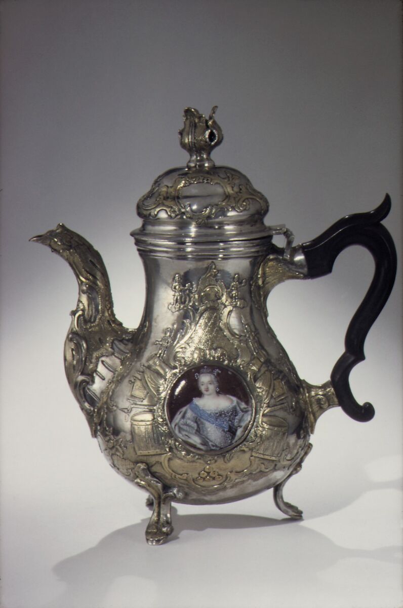 The service (47.51.1–.5) is thought to have been given by Empress Catherine II to Count Pyotr Rumiantsev, governor of the Ukraine and leader of the victorious Russian forces in the war with Turkey (1768–74). Enamel portraits on the utensils depict the imperial line from Peter the Great to Catherine II to her son, later Paul I. Facing are: Catherine II on the coffeepot, the empress Elizabeth on the teapot, the empress Anna on the bowl, Peter III on the cream jug, and Catherine I on the sugar-box lid. The shape and decoration recall silver utensils made in northern Germany, especially Berlin. German silver was highly esteemed in Russia, where a large German artistic community had influenced the transmission of Western forms since the time of Peter the Great. The goldsmith, born in Vyborg at the Gulf of Finland, might also have spent time in northern Germany during his journey years.