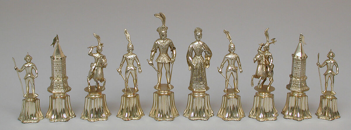 The costume of the principal figures appears to be a romantic version of medieval dress; certain features, however, of the dress of the queen are unmistakably of the decade 1840 to 1850, thus dating the entire set. A board of white and black mother-of-pearl squares set in silver-plated metal frame is en suite.