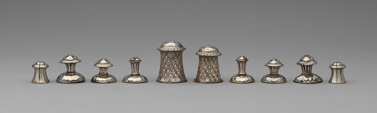 This set is for Muslim use. According to Ganeshi Lall of Agra, from whom it was acquired by Mr. Pfeiffer in 1931, it was made for Diwan Todar May, in the period of Akbar (the Timurid ruler of Hindustan from 1556 to 1605). There is no proof of such an early date, but these shapes were in existence in the eighteenth century, as we know from Thomas Hyde's Syntagama Dissertationem (Oxford, 1767; see Murray, History of Chess, p. 89). The set should probably be ascribed to the reign of Akbar II (1806–1837).