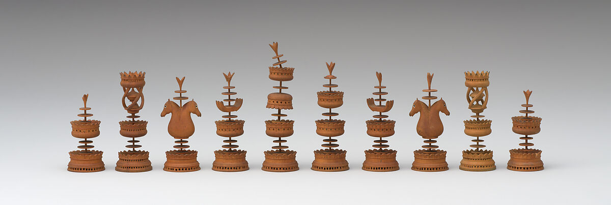 This set was the prize at a chess tournament between the cities of Aachen and Leipzig in 1887. The glass-topped box has a paper label reading: "Zur Erinnerung an die 3 Schachparthien zwischen Aachen & Leipzig vom 16/11 84 - 9/8 85" [In memory of three chess matches between Aachen and Leipzig from November 16, 1884, to August 9, 1885]. The winner of the matches was Leipzig. Germany produced a number of these elegantly made chess sets, usually of wood, but occasionally of ivory. Even more fragile chessmen were made in Denmark. A set in the Danish Museum of Industrial Art has "crow's nests" of lacy forms and twisting stems of triple "threads." A peculiarity with the knight is the development of two addorsed horse heads, a form that goes back to the early seventeenth century. In some sets there is nothing to indicate that the piece is associated with a horse, and it is distinguished by an incomplete ruff, or a cut aslant. This design occurs as early as the 17th century.