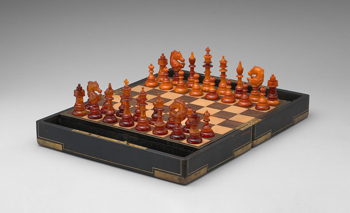 Each piece has a number from 1 to 32 wheel-engraved on the base, a feature noted in other German sets. The workmanship is typically German, and the horses are well modeled. A box of black Morocco leather, with brass mounts and gold tooling is en suite; it opens flat to reveal a hinged board with storage for the chessmen beneath. The set has been attributed to the Hohenzollerns, and although there is no proof for the suggestion, a symbol with words underneath, which would have indicated the original owner, has been obliterated from the box.