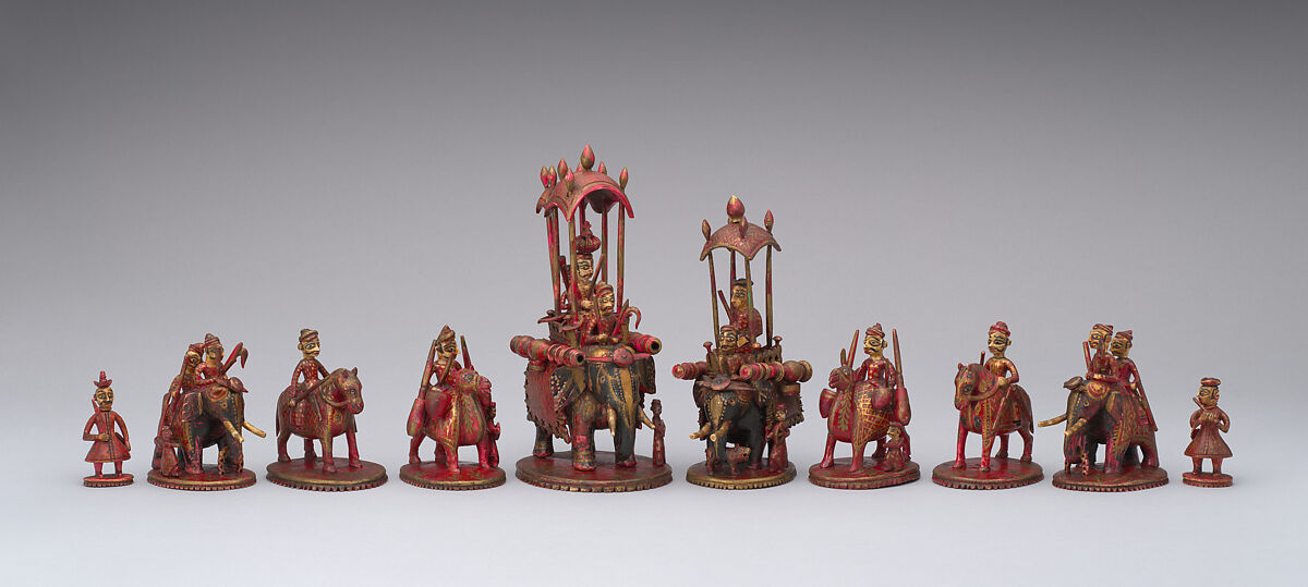 As is often the case with Indian sets made for foreigners, the principal pieces are in the same style on each side, but the pawns are differentiated. The kings, the ministers, and three of the camel-riders (bishops) have an attendant by the left foreleg of the elephant or camel on which they ride. The ministers' elephants hold lions in their trunks. On either side of their tall howdahs, the kings' and the ministers' elephants carry cannon. The rooks are elephants, as they often are in Hindu sets, and these hold an oversize horseshoe.