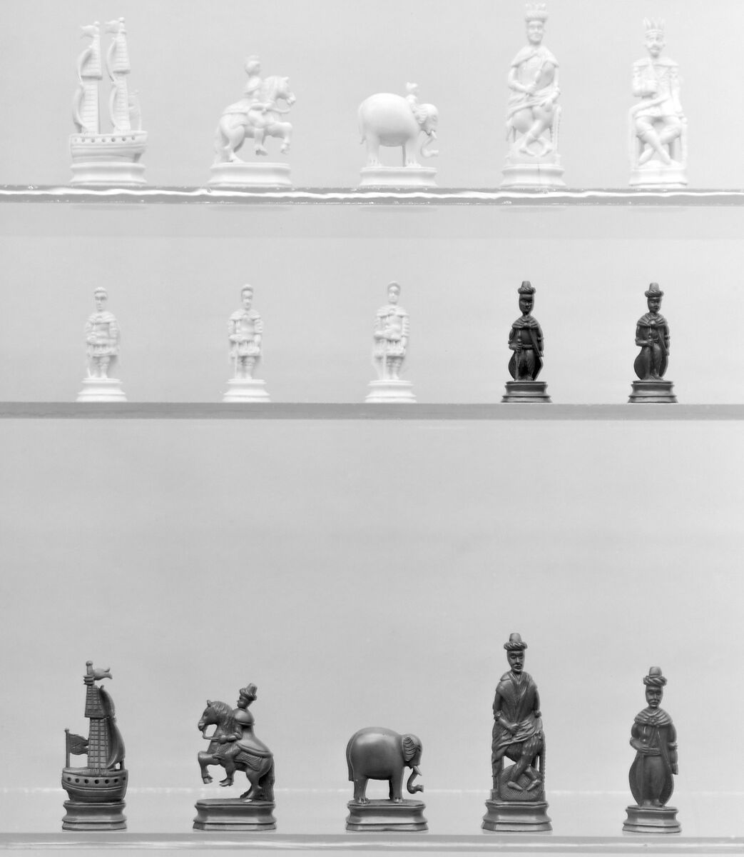 Eastern convention is followed in having a general instead of a queen, and an elephant instead of a bishop-with a rider for the "good" side, without for the 'bad" side. Russian convention has ships for rooks; here they too are differentiated, by being double-masted on the "good" side, having only one mast on the other. The white king, general, and pawns are dressed like Roman soldiers, the corresponding red pieces like Turks. The white king and general have European mid-eighteenth-century hairstyles, with long curls above the ears and long queues tied with a ribbon at the neck. This set is thus very characteristic of a group of Russian sets in which some Eastern conventions are seen alongside of European ones.