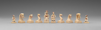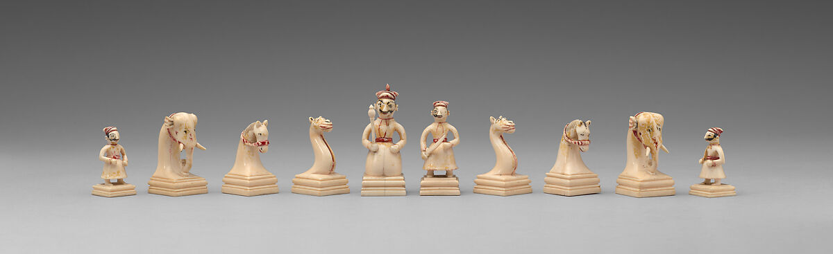 Although it is figural, this set was made for playing. The kings kneel and hold scepters; the queens are represented by generals although they are called viziers or counselors, and they bear swords. The elephant, instead of being in his original position (next to the king), has, as is common in Indian chess, displaced the rook at the corner of the board. In his own place is a camel. The knight is represented by a horse head. The pawns are small standing men, unarmed, wearing kiltlike skirts.