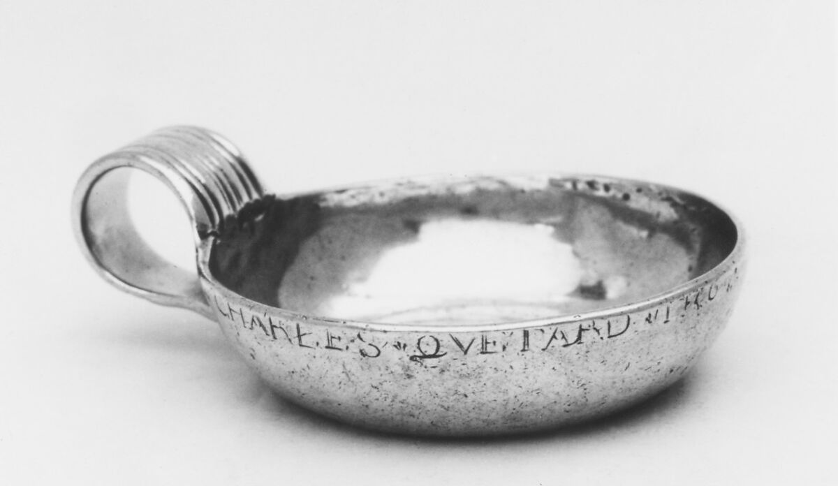 Also known as a tasse à vin, a tâte-vin, or a tastevin, a wine taster was used by a wine merchant to assess the quality, clarity, and color of wine. The reflective properties, resistance to corrosion, and the fact that it would not taint the wine in any way, made silver the ideal material for a winetaster. Shallow in form, these bowls frequently have a convex bottom. The polished surface, either left smooth or embellished with gadrooning and other decorations, would catch the light and reflect it throughout the wine so that it could be checked for impurities. Holding just a small amount of wine, silver wine tasters are often personalized with initials, names, and dates or coats-of-arms. Here the name of Charles Quetard, the latter presumably the name of a former owner, and a date (1750?) are engraved on the outside of the plain bowl. The interior is engraved with a medallion of St. Charles with a crucifix; the underside has an image of a cooper in his workshop. The grooved loop handle is cut in one with the bowl and is of a type known as “queue de cochon (or pig’s tail).”