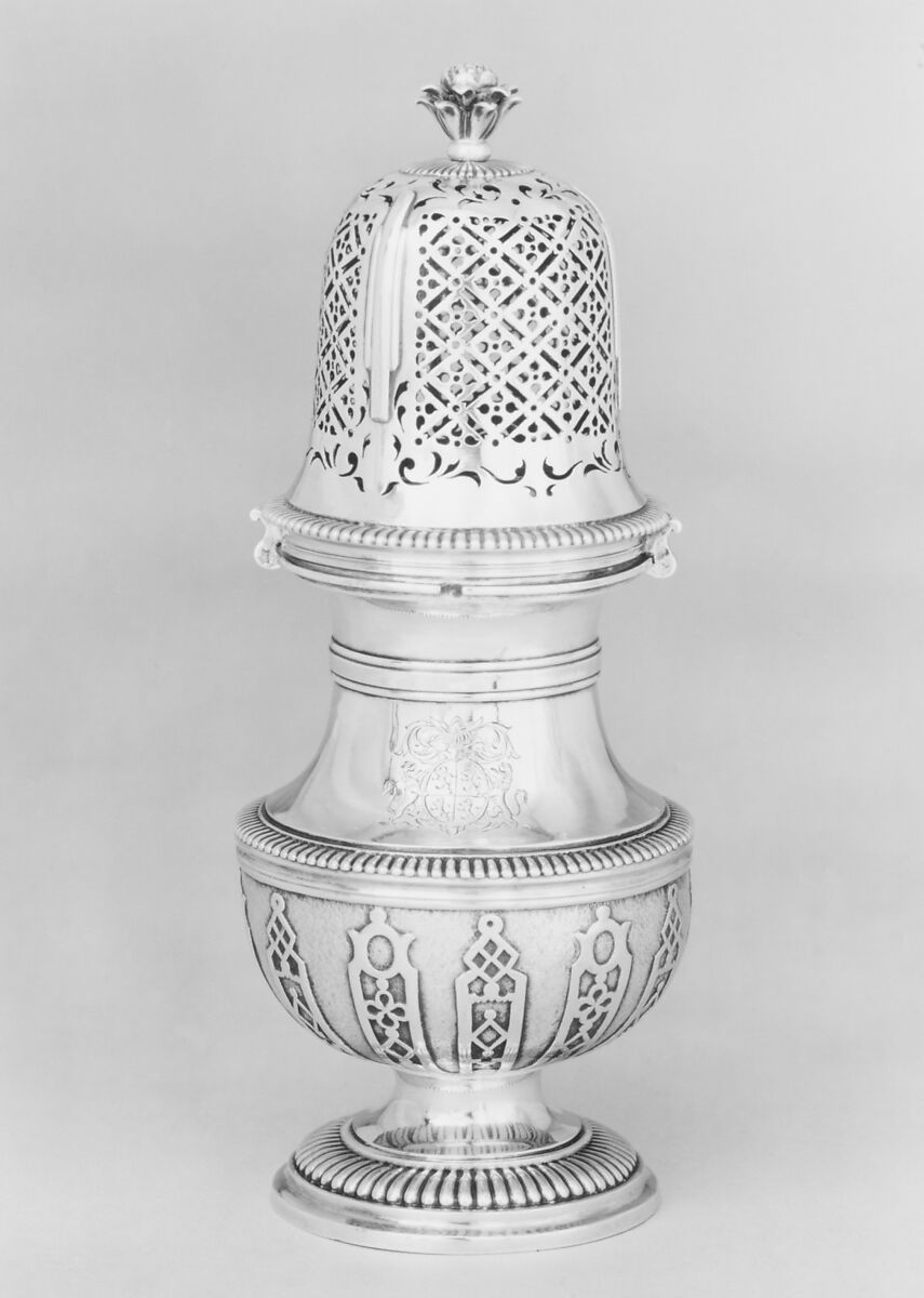 The early cylindrical form of the sugar caster with a pierced domed lid surmounted by a finial or knob, gave way in the eighteenth century to a more elegant baluster shape. The ornate openwork of the lid allowed the sugar to be sprinkled (saupoudroir) or “cast.” This example by the silversmith Jean Lacère of Toulouse, was made around 1732.