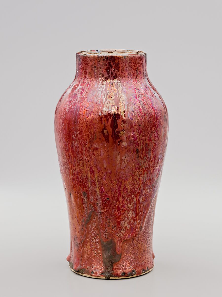 From Chelsea to Dedham, Robertson continued to pursue his passion for innovation, employing the grayish-white stoneware used for Dedham’s dinnerware to throw simple forms covered with bold combinations of colored and textured glazes. Despite his financial backers’ stipulation against further research into sang-de-boeuf, or oxblood, glazes, Robertson did not entirely abandon that costly pursuit. Many of his Dedham vessels have brilliant layerings of red and purple glazes. A thick, pitted, deep-red glaze embellishes this baluster shaped vase. In 1898 a writer for the magazine Arts for America probably had such a vase in mind when he wrote of the Dedham Pottery: "In high-fire work the temperature ranges between 3,000 and 4,000 degrees, and the glaze applied to the top of the vase bubbles like pitch and runs down the sides, coating the surface. In this class of work it is impossible to have the effects twice alike, for at the different firings the chemical conditions vary."