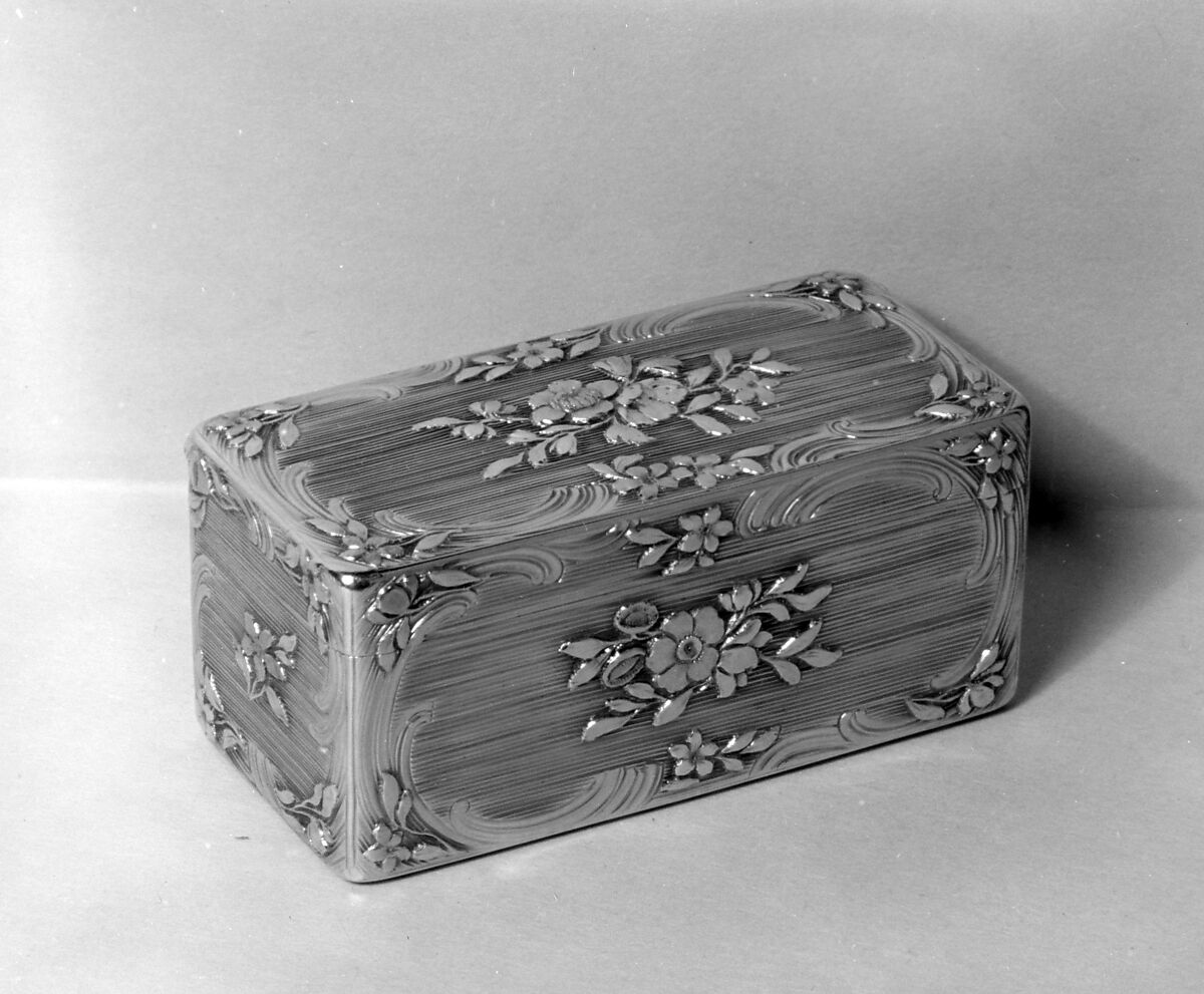 Catherine Wentworth, the former owner of this box, was evidently partial to work of varicolored gold as her collection includes many such snuffboxes. Prior to the Wentworth bequest entering The Met in 1948, very few examples of varicolored gold were in the collection. The celebrated Morgan collection of gold boxes (accessioned in 1917) is almost completely lacking in examples of this technique.