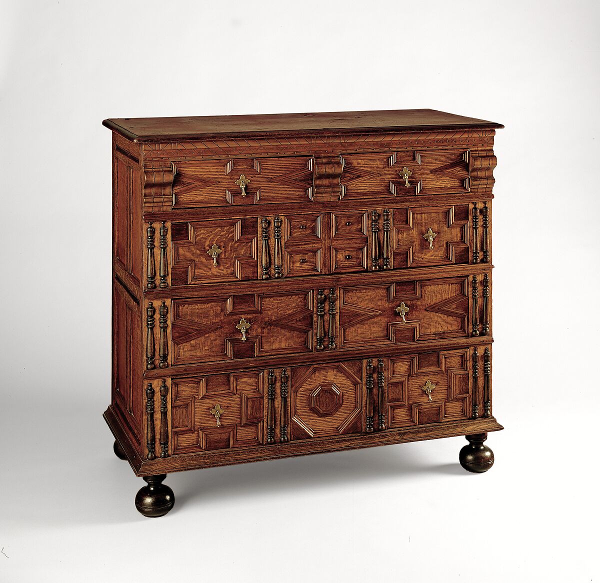 By the 1670s, the chest-of-drawers form, first made in Boston, had spread to neighboring Massachusetts port towns. Within the architectural framework of this chest, this is an intricate play of geometric shapes created by applied mitered moldings that oppose and echo one another. Such complexly patterned surface decoration links a group of furniture with histories of ownership in Salem.