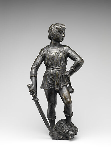 The present writer unmasked this and an identically solid-cast and unchased statuette,[1] formerly in the Jack and Belle Linsky Collection, as brazen, inept imitations of the excellent David in the Philadelphia Museum of Art, which is usually called Bellano but here given to Severo Calzetta da Ravenna in his formative years (see cat. 2). And this despite the claimed descent of our bronze from Sienese collections of some repute and its frequent endorsement as a work of Luca della Robbia, whose oeuvre contains nothing resembling it and little in the way of bronze, for that matter. Nevertheless, for John Pope-Hennessy, “the possibility cannot be ruled out that it was modelled by Luca della Robbia and cast in the shop of Maso or Giovanni di Bartolomeo.” It is pointless to consider these or other Renaissance names. Some traits absolutely rule out the quattrocento: a bleary expression, shapeless pageboy haircut, lifeless tunic (beneath which there are neither genitals nor breeches), and a sword handle the same width as the weapon. The smallness of Goliath’s head, hardly bigger than David’s, is another blunder. Alarmingly, the right wrists of both statuettes are broken in precisely the same place.